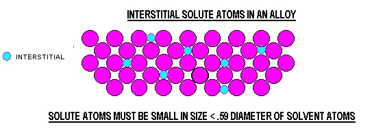 Interstitial. With interstitial type alloying, size of the atom becomes the major factor. The solute atoms must be small in size to fit into the spaces between the larger solvent atoms. Therefore the diameter of the solute atoms must be less than .59 of the solvent atoms.