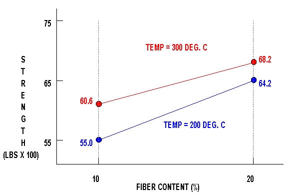Overall interpretation: Tensile strength can be increased by increasing temperature and fiber content. Since the fiber content effect is (4.2/2.4 = 1.75 times) greater than the temperature effect, the experiment suggests that the effect of fiber content = 1.75 times the effect of processing temperature at the settings observed.