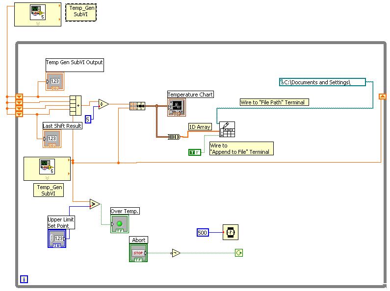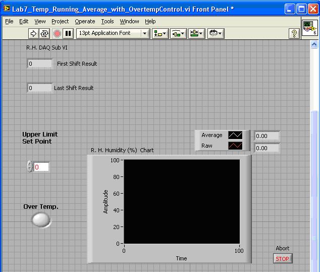 1. Open the previously created VI used to acquire temperature data. Remember this laboratory exercise incorporated SHIFT REGISTERS and provided a means to average 5 points then plot both raw and averaged values to a WAVEFORM CHART. An example is shown on the following page.