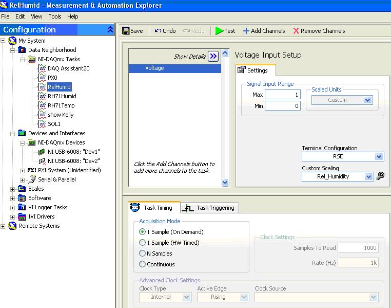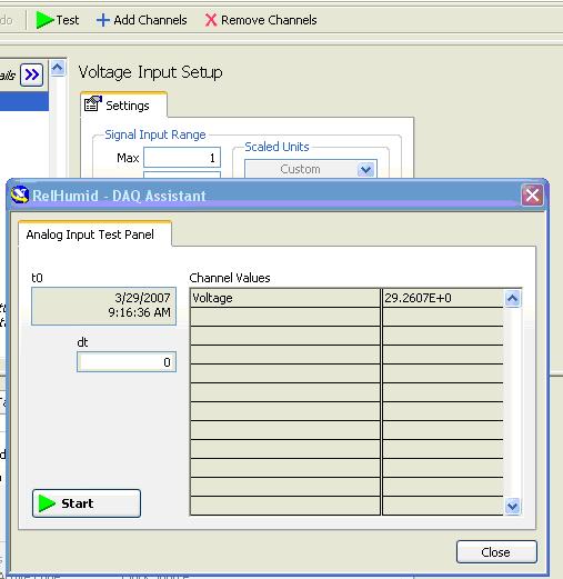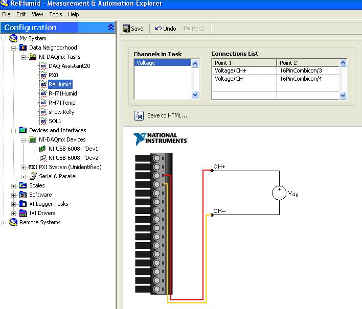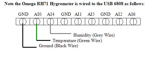 In order to acquire external data, a Data Acquisition (DAQ) device must be wired and connected to the computer running LabView. We will be using the NI-USB- 6808 DAQ unit. The follow steps are required to configure the device to read external humidity readings from an Omega RH71 hygrometer.