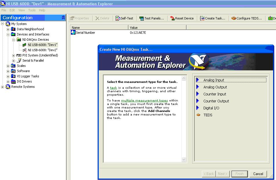 click on the NI-USB-6808 device icon and select CREATE TASK.
