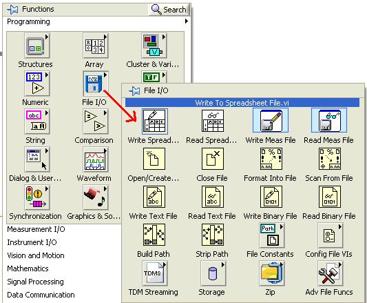 2. Under FUNCTIONS, FILE I/O, select the WRITE TO SPREADSHEET options and place inside the while loop. Note the function location is shown below.