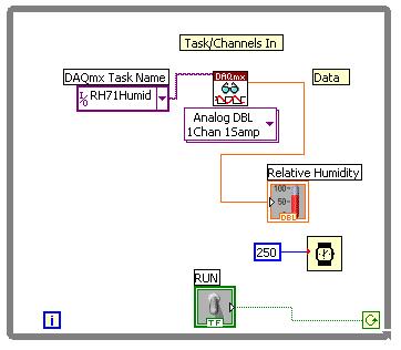 In this exercise, you will create a VI that will monitor current Relative Humidity (R.H.) along with the average R.H. on a waveform chart. It will employ a while loop and shift register to do this. Elements added to the shift register will store R.H. data from previous iterations, and be used to calculate the average R.H.